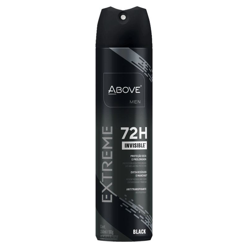 O Desodorante Antitranspirante Aerosol Above Men Extreme Invisible Black 72h foi desenvolvido para o homem que precisa de proteção eficaz e duradoura. Com 72 horas de proteção contra o suor e odores, ele garante frescor o dia todo, sem deixar resíduos nas roupas. Sua fórmula inovadora Invisible Black proporciona uma proteção invisível, sem manchas, permitindo que você se mova livremente e com confiança.