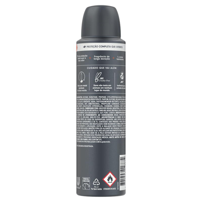 Com a exclusiva tecnologia Antibac que combate o mau cheiro, o Antitranspirante Dove Men+Care Aerosol Antibac proporciona proteção de 48 horas contra o suor e contra o mau odor. O que faz de um antitranspirante o aliado perfeito para o dia a dia? Para nós, é a união entre potência e delicadeza. É por isso que a linha de antitranspirantes Dove Men+Care combina uma avançada fórmula, que contém 1/4 de creme hidratante, com ingredientes que ajudam a proteger a pele, reduzindo o risco de irritações. Desodorante sem álcool. Disponível em roll-on e aerossol, Dove Men+Care tem o que você precisa para se sentir sempre seguro e com uma agradável sensação de frescor que dura o dia inteiro. Dove Men+Care celebra uma nova definição de força masculina, em que o cuidado com o bem-estar do seu corpo é o centro de tudo. É por isso que Dove oferece a você uma linha completa de produtos, de antitranspirantes a tratamentos para os cabelos, desenvolvida com poderosos ingredientes pensados em cada uma das suas necessidades. O resultado é proteção e cuidado completos e duradouros. Experimente os desodorantes, sabonetes, shampoos, condicionadores e cremes para pentear de Dove Men+Care e conheça um novo jeito de se cuidar. Dove Men+Care celebra uma nova definição de força masculina, em que o cuidado com o bem-estar do seu corpo é o centro de tudo.