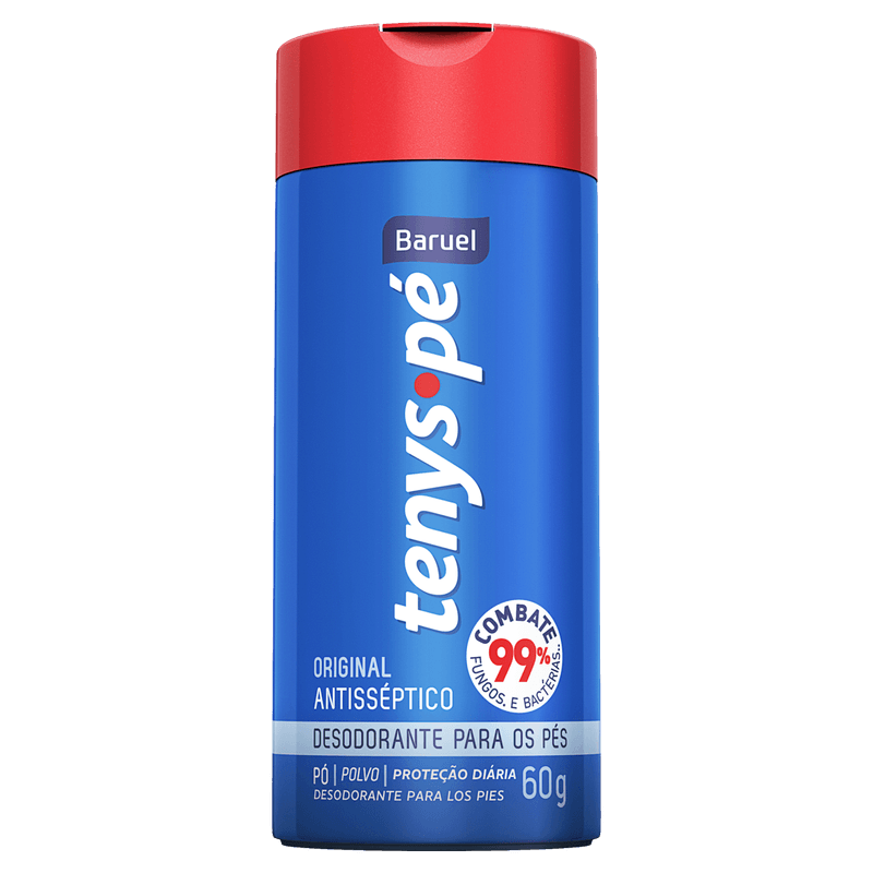 O Talco Desodorante para Pés Tenys Pé Baruel Original 60 g é um produto indicado para a higiene e proteção dos pés, com ação que combate até 99% de fungos e bactérias, mantendo os pés secos, protegidos e livres de odores.