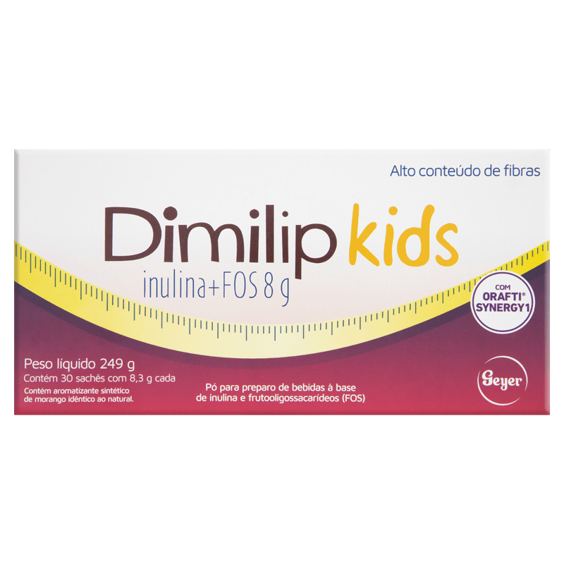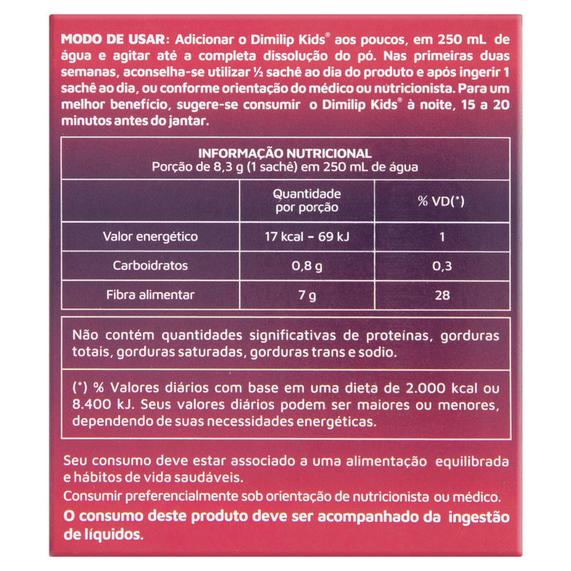 Dimilip Kids é um suplemento alimentar em pó sabor morango, apresentado em caixa com 30 sachês de 8,3 g cada, indicado para suplementação e complementação nutricional infantil, especialmente no controle de peso.