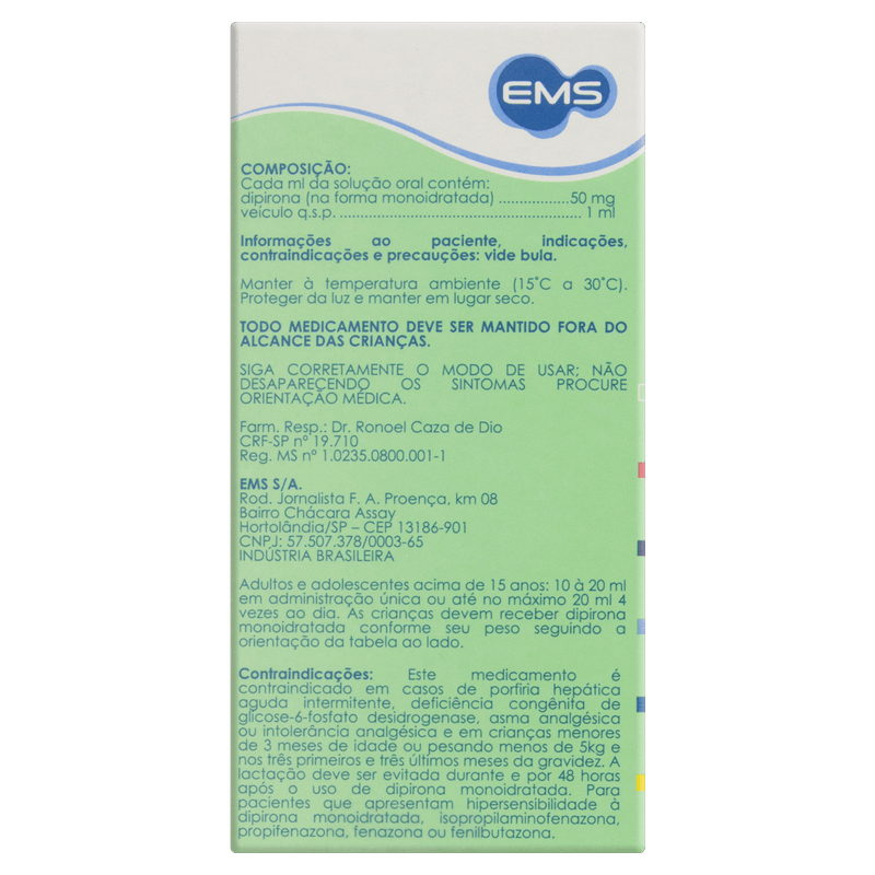 Contraindicado para pacientes com hipersensibilidade à dipirona ou a outros derivados pirazolônicos, para aqueles com problemas na medula óssea, porfiria hepática aguda, deficiência de G6PD, e durante gravidez e amamentação sem orientação médica.