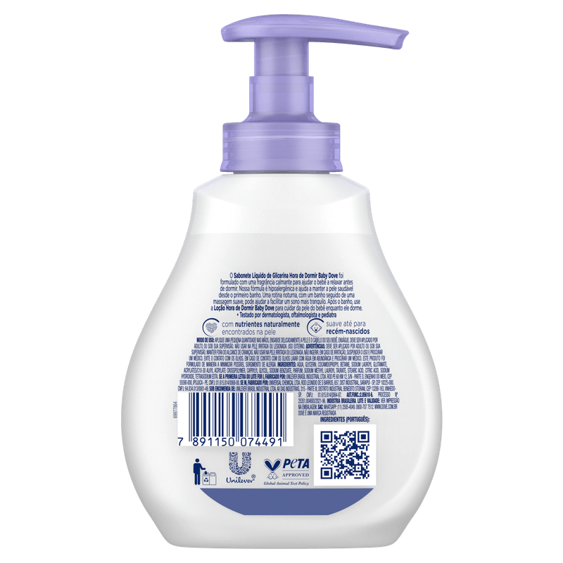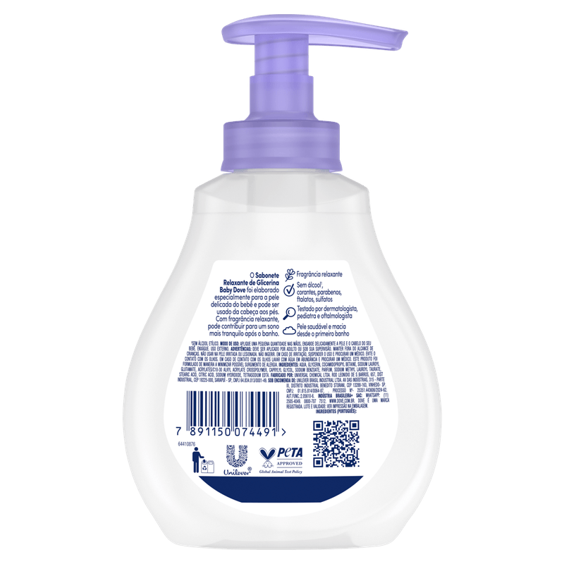 O Sabonete Líquido de Glicerina Hidratação Relaxante Dove Baby é ideal para a hora do banho do seu bebê. Com uma fórmula suave e enriquecida com glicerina, proporciona uma limpeza delicada e hidratação profunda, deixando a pele do seu pequeno macia e bem cuidada. Especialmente desenvolvido para a pele sensível dos bebês, garante um banho relaxante e agradável. Livre de fragrâncias fortes e hipoalergênico, é seguro para o uso diário. Para melhores resultados, aplique uma pequena quantidade na palma da mão, esfregue suavemente e enxágue. Evite o contato com os olhos e mantenha fora do alcance de crianças. Apresentado em um frasco prático com pump, facilita a aplicação e evita desperdícios. Ideal para bebês e crianças pequenas, é a escolha perfeita para um banho relaxante e hidratante.