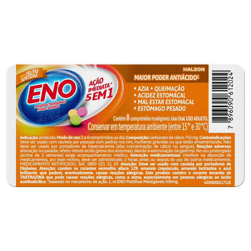 Eno atua diretamente no alívio dos sintomas causados pelo excesso de ácido no estômago, neutralizando-o rapidamente. Cada embalagem contém 12 blisters com 8 pastilhas mastigáveis, facilitando o uso e o transporte. O produto é isento de prescrição médica, indicado para uso oral e deve ser armazenado em temperatura ambiente, protegido da luz e fora do alcance de crianças. Leia a bula antes de usar para garantir segurança e eficácia no tratamento.