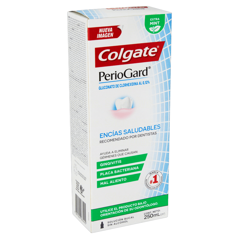 Este enxaguante bucal Colgate Periogard Extra Mint sem álcool contém 0,12% de clorexidina, ideal para manter a gengiva saudável. Ele é seguro e eficaz para a prevenção da gengivite.