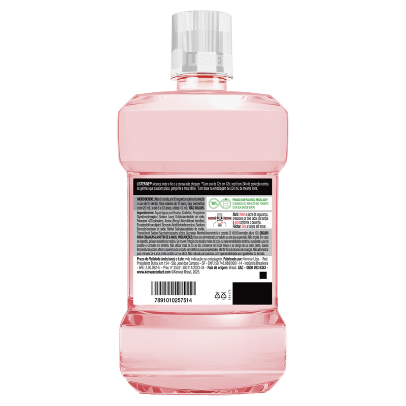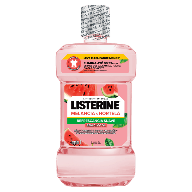 Adicione Listerine® melancia & hortelã enxaguante bucal sem álcool, 1l à sua rotina e limpe aonde a escova não alcança, eliminando até 99% dos germes* causadores de mau hálito, placa bacteriana e gengivite.