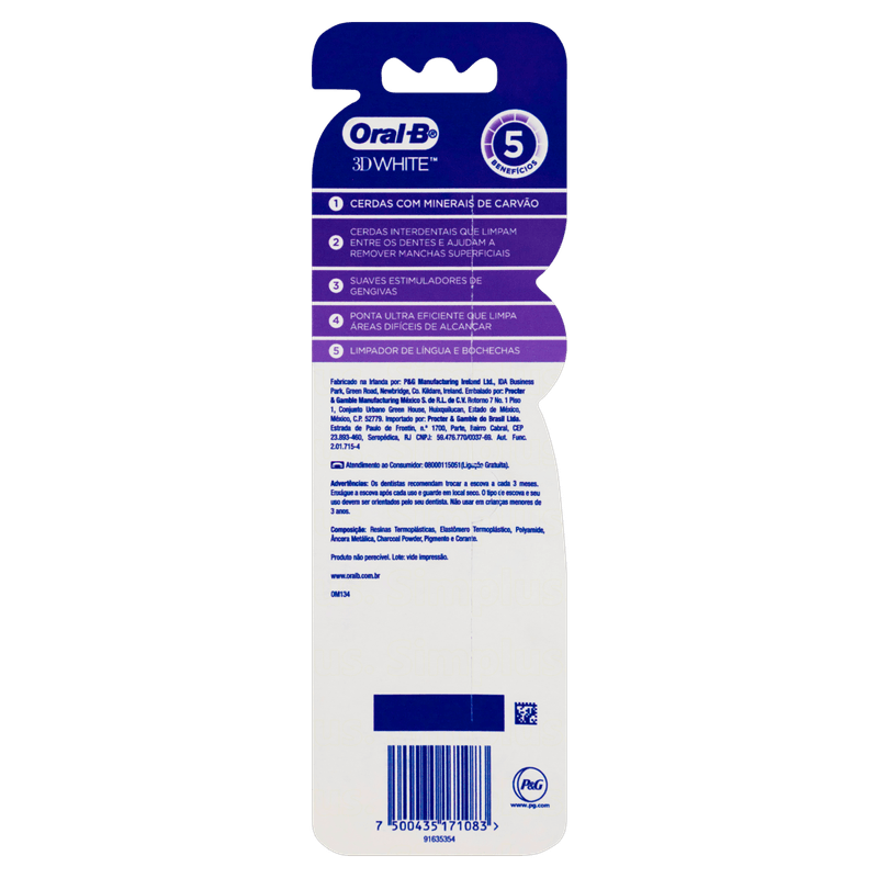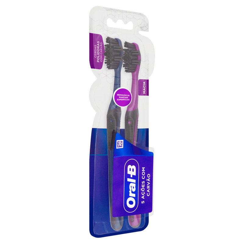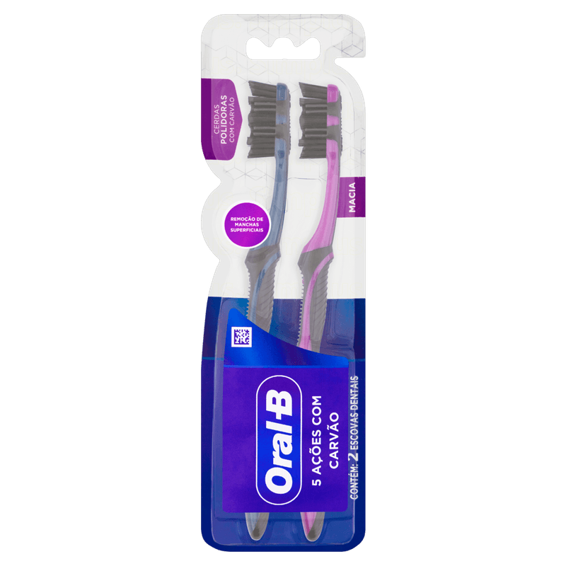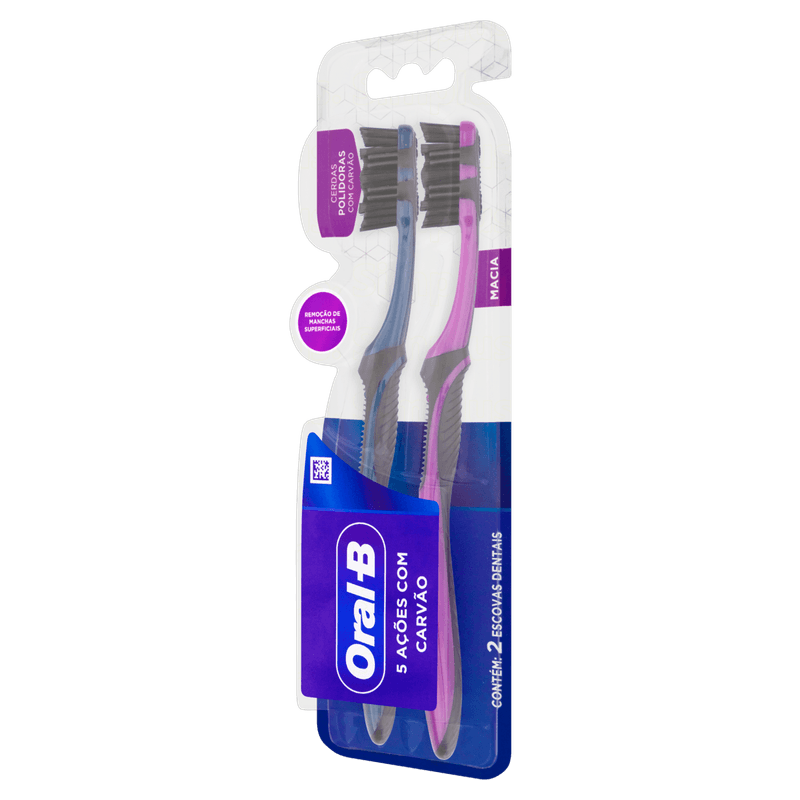 A Escova Dental Oral-B 5x Ações com Carvão foi especialmente desenvolvida para proporcionar uma melhor experiência de escovação. Graças a sua tecnologia de cerdas polidoras com minerais de carvão que te ajudam na remoção das manchas superficiais dos seus dentes. Além disso, ela conta com cerdas interdentais que limpam entre seus dentes para te proporcionar uma sensação de limpeza 100%. Possui massageadores de borracha que estimulam suas gengivas, com uma ponta ultra efetiva para limpeza em áreas de difícil alcance.