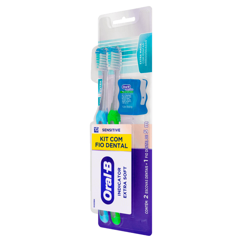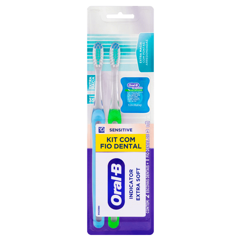 O Kit 2 Escovas de Dente Sensitive Oral-B com Cerdas Extra Macias e Fio Dental Complete é indicado para higiene bucal diária, oferecendo limpeza profunda e delicada para dentes e gengivas. As escovas possuem cerdas extra macias com pontas arredondadas e cerdas indicadoras azuis que desbotam para sinalizar a troca, garantindo cuidado eficaz e suave.