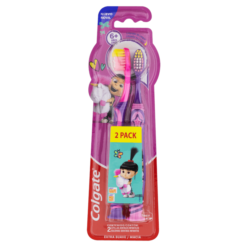 A Escova Dental Infantil Colgate Meu Malvado Favorito 6+ anos é uma escova manual desenvolvida especialmente para crianças a partir de 6 anos, que possuem uma combinação de dentes de leite e permanentes. Apresentada em embalagem com duas unidades, conta com cerdas extra macias multinível, cabeça compacta, limpador de língua e cabo antiderrapante com base de sucção, proporcionando higiene bucal adequada e segura para o público infantil.
