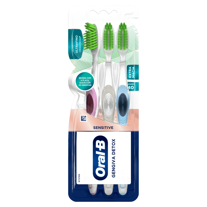 A Escova de Dentes Oral-B Gengiva Detox 3 Unidades é uma escova tradicional manual com tecnologia UltraThin e cerdas cruzadas Criss Cross, projetada para limpeza delicada abaixo da linha da gengiva e remoção eficaz da placa bacteriana, contribuindo para a saúde e aparência das gengivas.