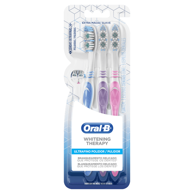 A Escova de Dentes Whitening Therapy Oral-B é uma escova tradicional manual com cerdas ultrafinas e extra macias, disponível em kit com 3 unidades. Desenvolvida para adultos, ela oferece um branqueamento delicado ao remover manchas superficiais, promovendo uma limpeza eficaz e proteção dos dentes.