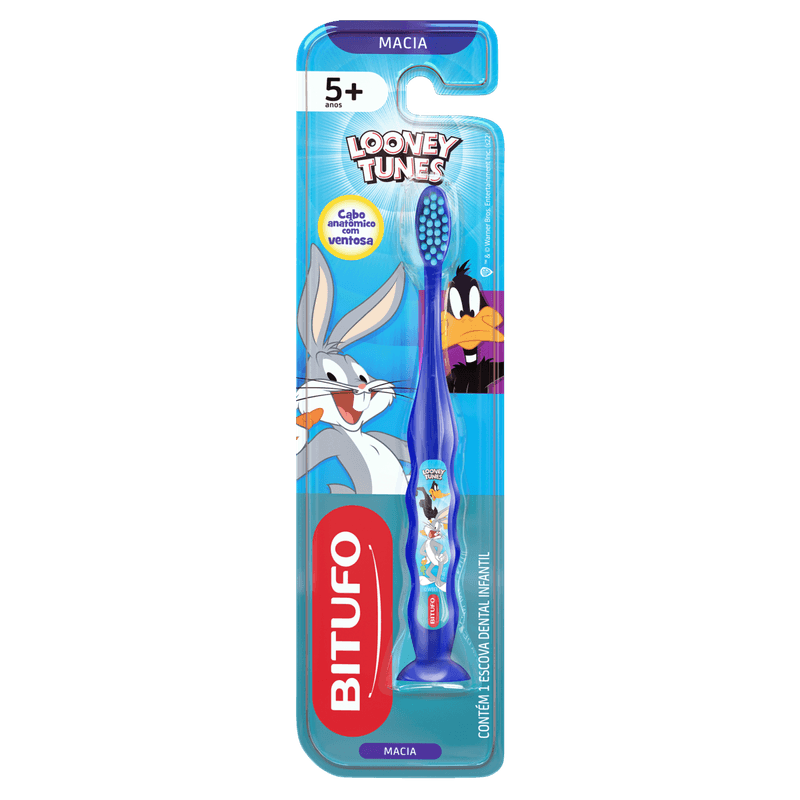 Escova de Dente Bitufo Infantil Looney Tunes é ideal para crianças a partir dos 5 anos de idade. Ela promove a limpeza eficaz, possui tamanho perfeito para boca das crianças e cerdas macias e arredondadas para higienizar delicadamente. O cabo anatômico é fácil de segurar e as ventosas mantém a escova em pé.