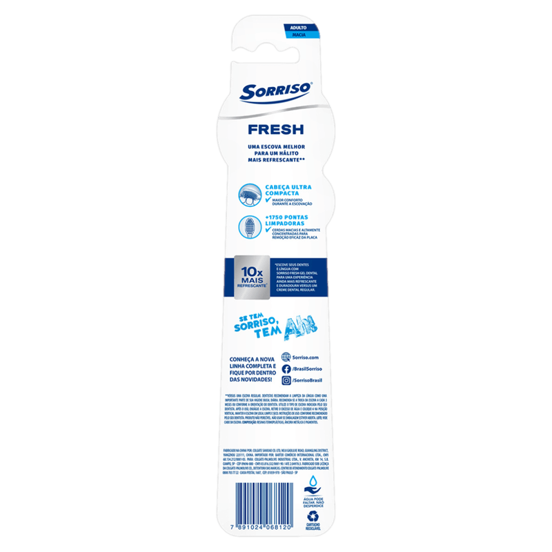 Escova Dental Sorriso Fresh garante higiene completa e refrescância duradoura. Suas mais de 1.750 cerdas macias e afuniladas, de alta densidade, removem a placa bacteriana sem agredir a gengiva, proporcionando conforto e eficácia na escovação diária. Com cabeça ultra compacta e arredondada, alcança até os dentes mais difíceis, enquanto o cabo moderno, transparente e brilhante oferece conforto e estilo.