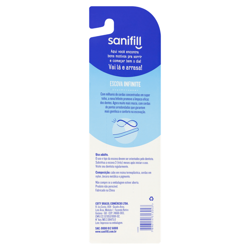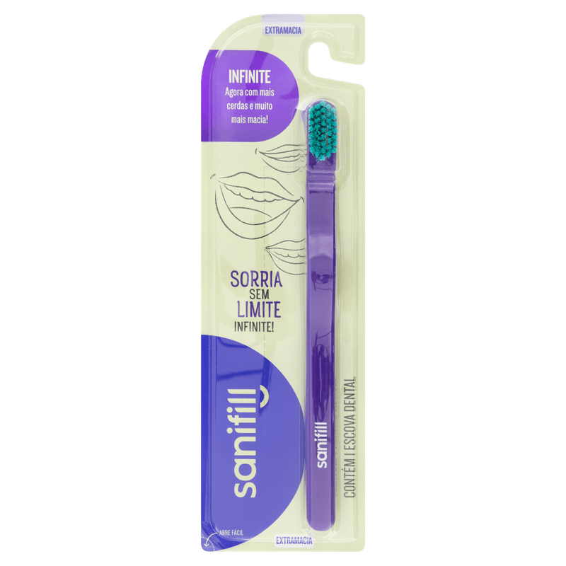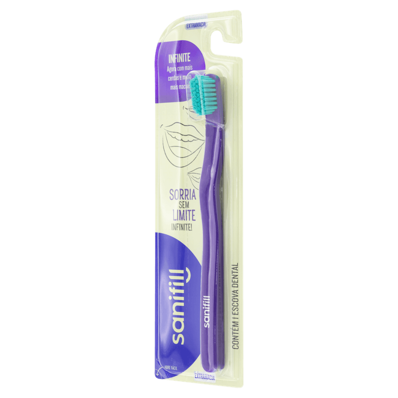 A Escova Dental Infinite MCI Extra Macia da Sanifill é uma escova dental com cerdas extramacias, indicada para a higienização bucal diária. Apresenta cabo roxo com cerdas azul-esverdeadas, ideal para uma limpeza delicada e eficaz dos dentes e gengivas.