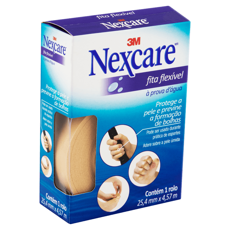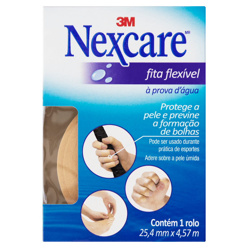 "Fita Flexível a Prova D'Agua Nexcare® - 25 mm x 4,5 m. Proteção versátil para todas as suas atividades, a Fita Flexível à Prova D'Agua Nexcare® é a combinação perfeita entre alta tecnologia e conforto superior. Além de acompanhar os movimentos do corpo, esta inovação da 3M protege a pele e previne a formação de bolhas nos pés, nas mãos e em outras partes do corpo. Proteção versátil para todas as suas atividades, a Fita Flexível à Prova D'Agua Nexcare® é a combinação perfeita entre alta tecnologia e conforto superior. Além de acompanhar os movimentos do corpo, esta inovação da 3M protege a pele e previne a formação de bolhas nos pés, nas mãos e em outras partes do corpo. Seu material é feito por uma espuma que amortece e protege contra o atrito, e seu adesivo garante forte adesão e permanece sobre a pele úmida durante a prática de exercícios. É um esparadrapo Nexcare® recomendado para proteção durante diversas atividades, como musculação, cross fit, vôlei, basquete, ballet, tênis, artes marciais, entre outros. Como ela é 100% à prova d’água, deixando a pele transpirar, também pode ser utilizada durante o banho ou em atividades na água, como natação. A Fita Flexível à Prova D'Agua Nexcare® é flexível, acompanhando os movimentos do corpo sem descolar, e adere à pele úmida, permanecendo no lugar durante a prática de exercícios, no banho ou dentro d’água. É uma fita extremamente versátil, protegendo a pele de calos e bolhas em regiões de atrito. Além disso, ela corta fácil, é confortável e discreta na pele e possui fácil aplicação e remoção, sem deixar resíduos. Trata-se de um produto hipoalergênico e dermatologicamente testado. Seu material é feito por uma espuma que amortece e protege contra o atrito. Seu adesivo garante forte adesão e permanece sobre a pele úmida durante a prática de exercícios. Flexível, acompanha os movimentos do corpo sem descolar. Adere à pele úmida, permanecendo no lugar durante a prática de exercícios, no banho ou dentro d’água. Super versátil (pode ser utilizada para várias aplicações para proteger a pele de calos e bolhas em regiões de atrito). Corta fácil, é confortável e discreta na pele e possui fácil aplicação e remoção, sem deixar resíduos. Protege a pele e previne a formação de bolhas nos pés, nas mãos e em outras partes do corpo. Recomendada para proteção durante diversas atividades, como musculação, cross fit, vôlei, basquete, ballet, tênis, artes marciais e práticas na água, como natação.
