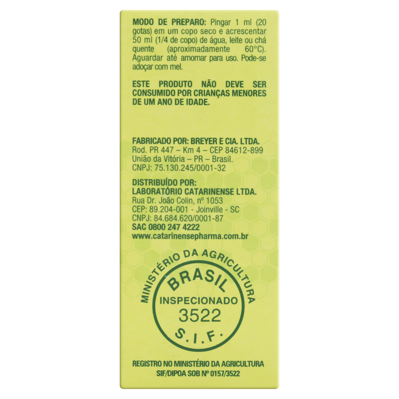 Recomenda-se o uso de 10 a 15 gotas diluídas em água, leite ou chá quente, de 2 a 3 vezes ao dia. O produto deve ser conservado em local fresco e seco, e consumido em até 30 dias após aberto. Não é indicado para crianças menores de 1 ano. Evite o uso em caso de alergia a própolis ou componentes da fórmula.