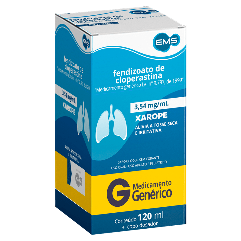 O Fendizoato de Cloperastina 3,54mg/ml Genérico EMS é um xarope indicado para o tratamento sintomático da tosse seca, especialmente quando não há presença de secreções. Com ação rápida, proporciona alívio eficaz da tosse irritativa em cerca de 30 minutos após a administração oral. Ideal para adultos e crianças até 12 anos, este antitussígeno se destaca pela sua fórmula confiável e pela praticidade do uso em dose oral.