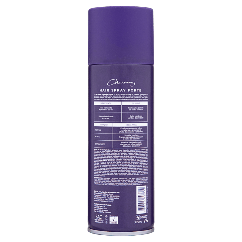 O Spray Laquê Charming Jato Seco fixação Forte é ideal para quem precisa deixar os cabelos bem arrumados durante eventos ou festas importantes. Sua fórmula além de proporcionar brilho e fixação eficientes ainda protege os fios dos danos causados pelo calor do secador e da chapinha.