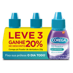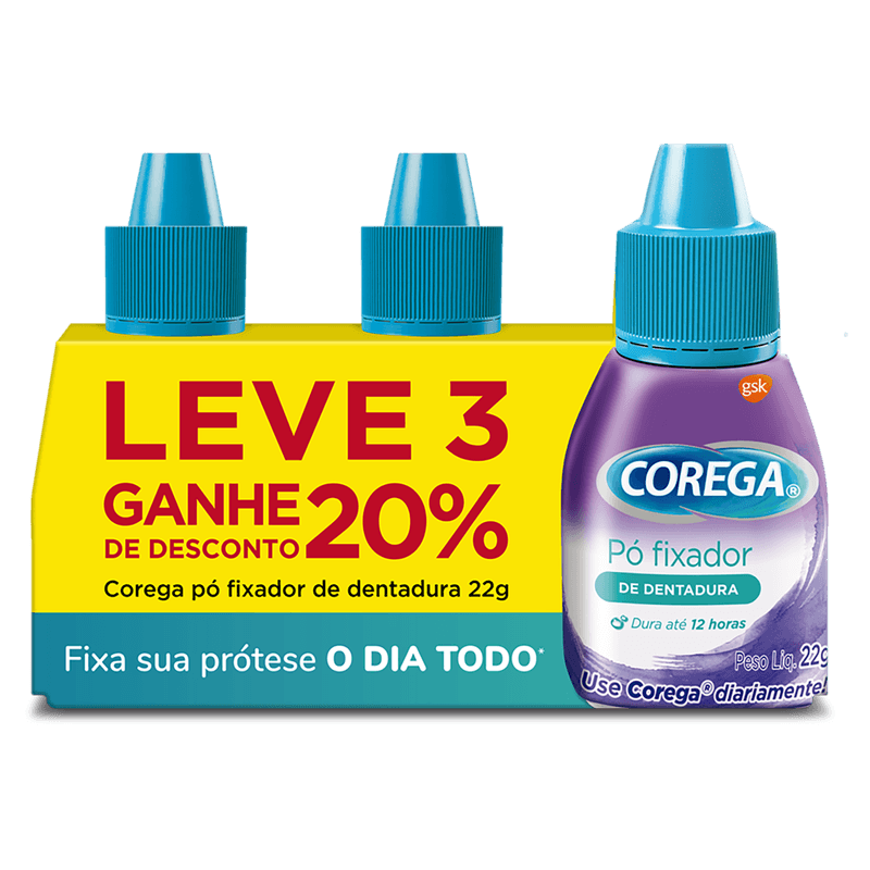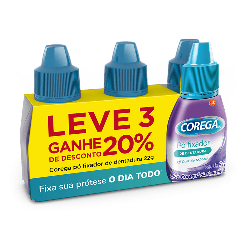O Fixador de Dentadura Pó Corega Pack com 3 unidades de 22g cada é um produto da linha Corega, indicado para fixação de dentaduras, proporcionando fixação por até 12 horas com sabor menta.