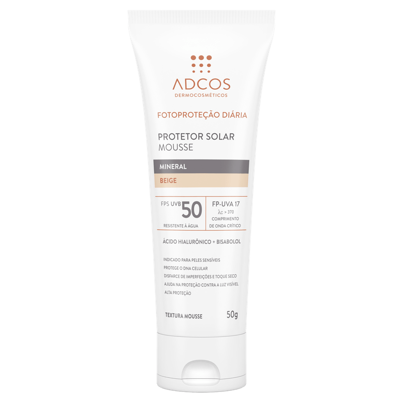 O Fotoprotetor Adcos Mousse Mineral FPS 50 Cor Bege 50g é um protetor solar em textura mousse, com alta proteção mineral contra raios UVA, UVB, luz visível, infravermelho e poluição, indicado para proteção diária da pele, com efeito blur e controle da oleosidade.