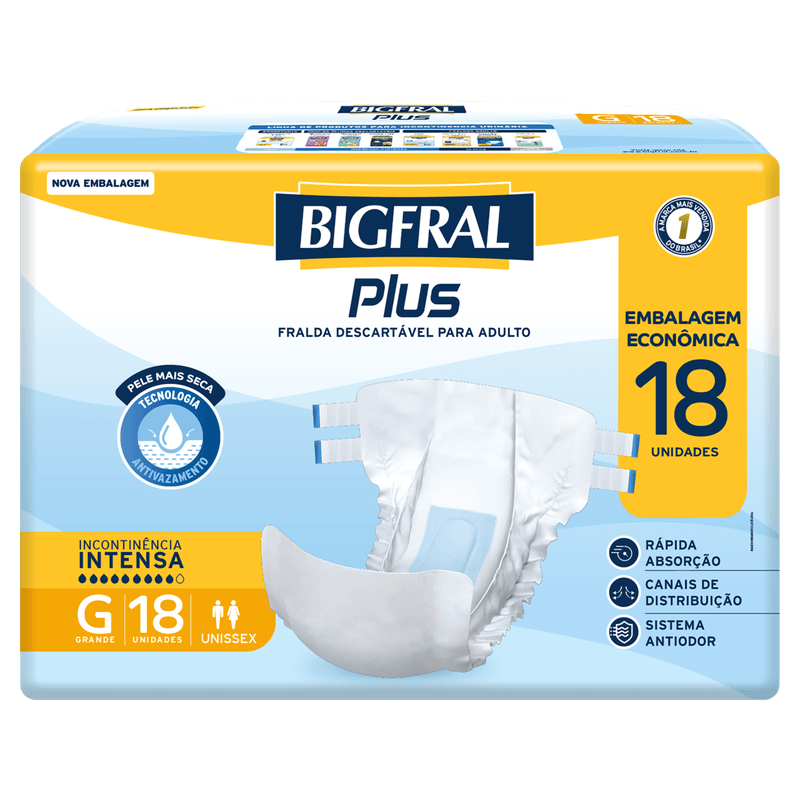A fralda descartável Bigfral Plus possui ação rápida de absorção e barreiras antivazamento que atuam diretamente na área de incontinência urinária, com composição que prioriza o cuidado da pele. Apresenta textura macia e formato anatômico, ideal para adultos com pele sensível. Cada pacote contém 18 unidades no tamanho G, adequado para uso unissex. Produto econômico, prático e eficiente, indicado para quem busca conforto, higiene e proteção diária com máxima segurança.