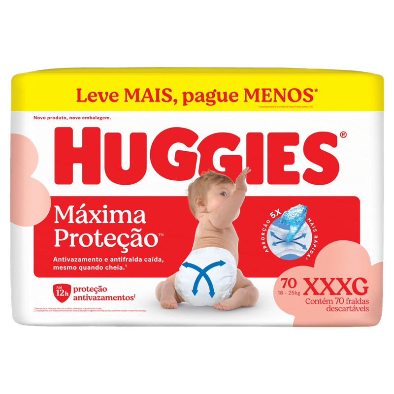 A Fralda Descartável Infantil Máxima Proteção tamanho XXXG é indicada para bebês maiores, oferecendo ultraabsorção para uso diurno e noturno com foco em proteção e conforto. Desenvolvida para garantir ajuste anatômico e flexibilidade, proporciona segurança contra vazamentos mesmo durante o movimento do bebê.