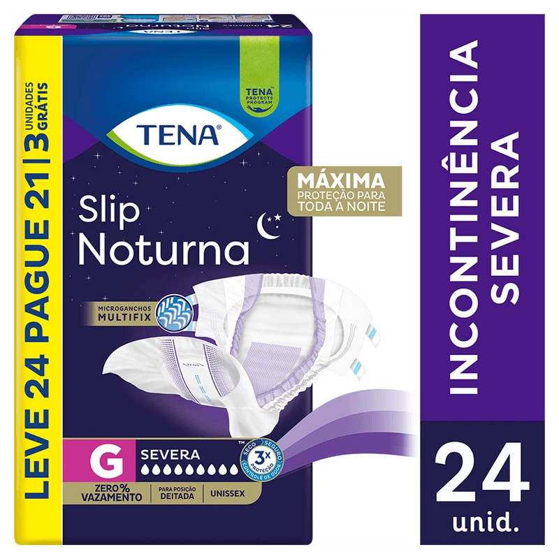 A Fralda Descartável Adulto Tena Slip Noturna tamanho G é indicada para incontinência urinária moderada a intensa, oferecendo máxima absorção para uso noturno em adultos com peso entre 70 e 90 kg.