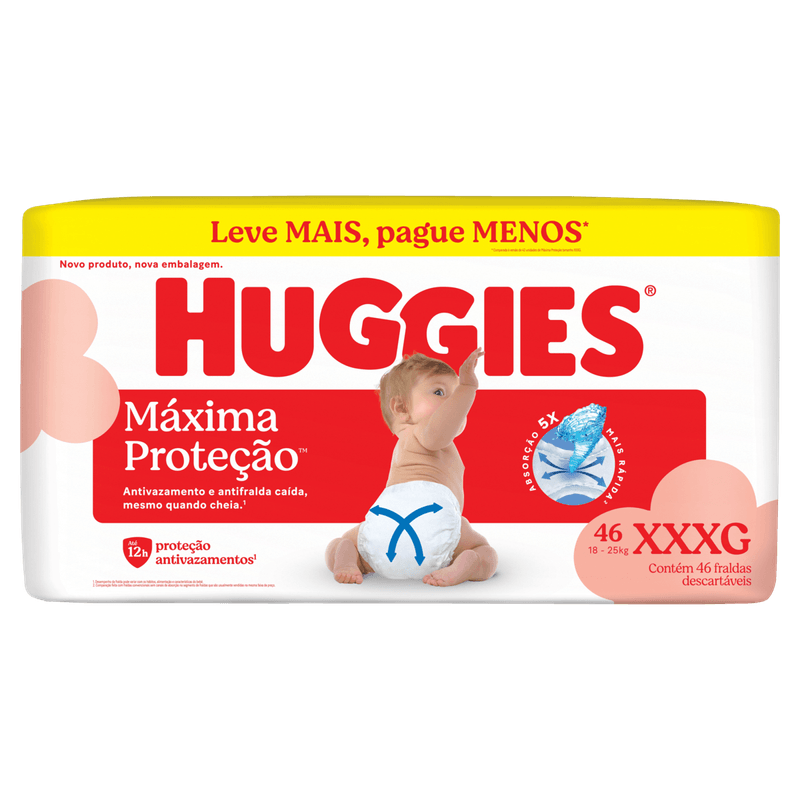 Fralda Descartável Infantil Huggies Máxima Proteção XXXG 18 a 25kg Pacote 46 Unidades Leve Mais Pague Menos