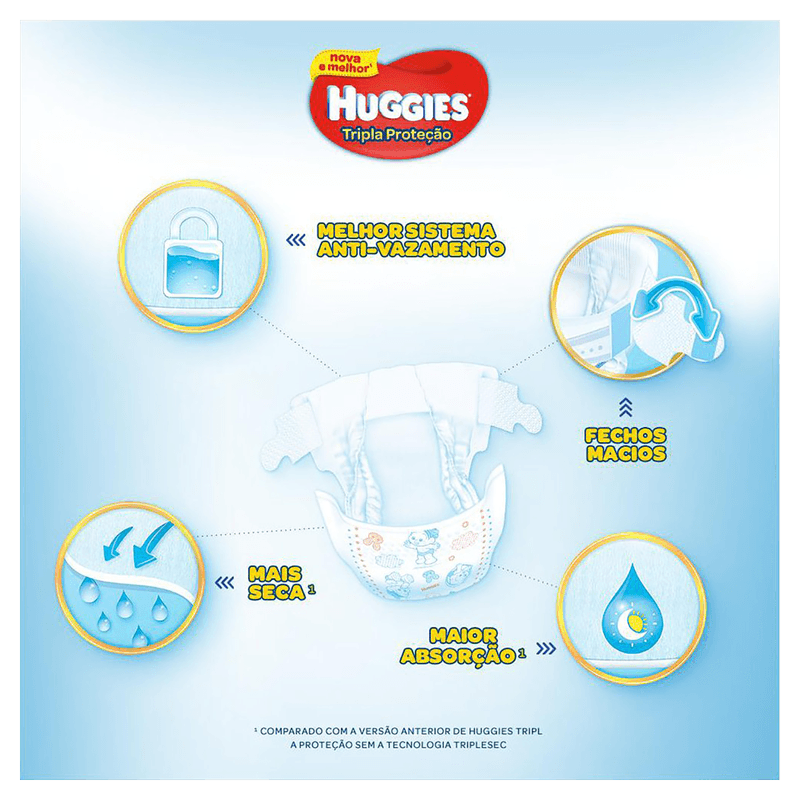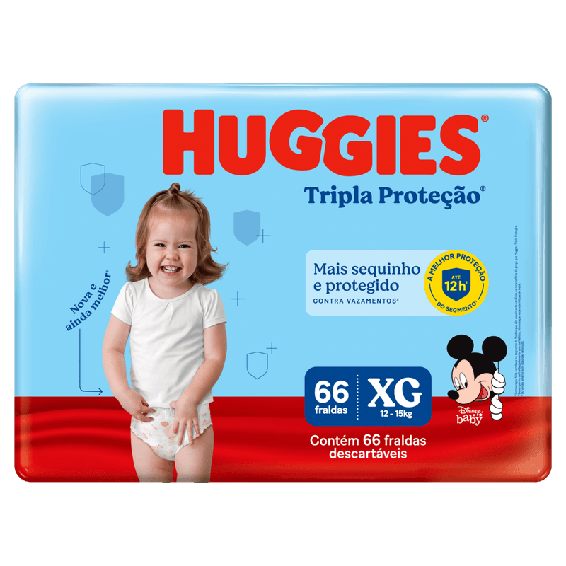 A Fralda Descartável Infantil Huggies Rápida Absorção XG com 66 unidades oferece proteção eficaz e conforto para bebês de 12 a 15 kg. Com tecnologia Xtra-Protect e canais de absorção rápida, mantém a pele seca por até 12 horas, prevenindo assaduras e vazamentos graças às barreiras duplas e centro reforçado. Seu formato anatômico, cintura elástica e fechos adesivos ajustáveis garantem um ajuste perfeito e liberdade de movimento, ideal para o dia a dia do bebê.