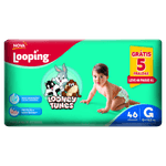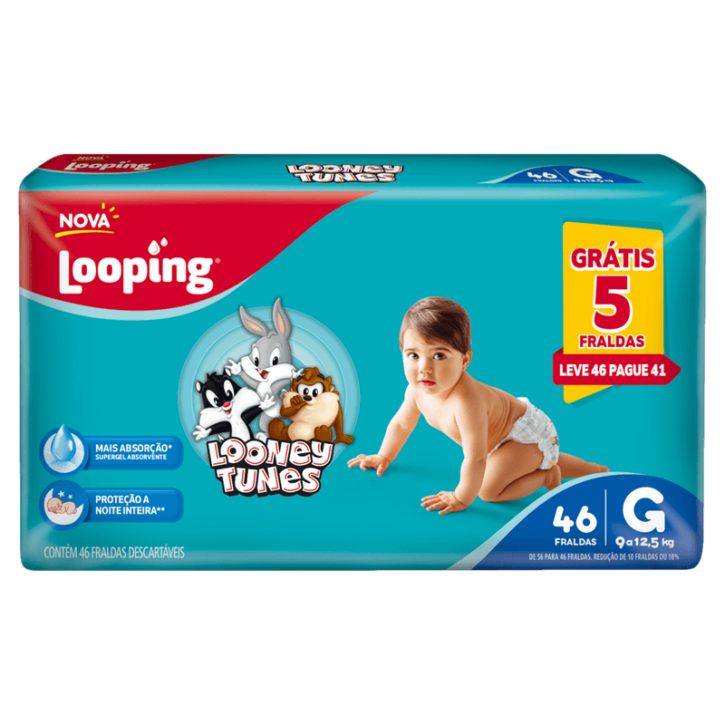 A Fralda Looping Looney Tunes Hiper tamanho G é perfeita para bebês maiores que precisam de conforto e proteção durante o dia e a noite. Com alta absorção e tecnologia de secagem rápida, mantém a pele do bebê sempre seca, evitando irritações graças à sua fórmula hipoalergênica. O design com personagens Looney Tunes torna o uso mais divertido, enquanto o sistema anti-vazamento e o fechamento adesivo ajustável garantem segurança e praticidade para crianças ativas.