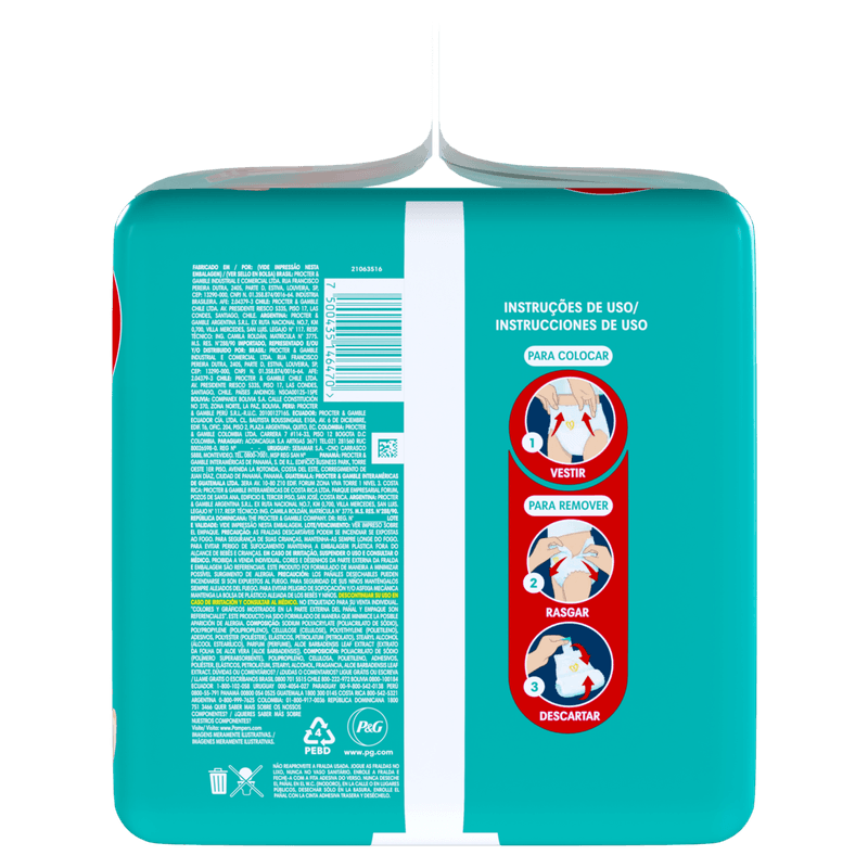 Para usar, vista a fralda como uma calça, certificando-se de que o desenho esteja voltado para a frente do bebê. Para remover, rasgue as laterais e descarte enrolando com a fita adesiva. É importante trocar a fralda regularmente para evitar irritações e assaduras. Em caso de qualquer reação na pele, suspenda o uso e consulte um médico. A fralda é dermatologicamente testada, hipoalergênica e contém extrato de Aloe barbadensis, que ajuda a acalmar e proteger a pele delicada do bebê.