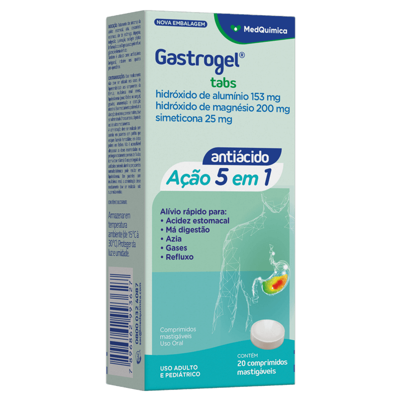 Cada comprimido contém 153 mg de hidróxido de alumínio (equivalente a 200 mg de hidróxido de alumínio gel-seco), 200 mg de hidróxido de magnésio e 25 mg de simeticona, que atuam em conjunto para neutralizar o excesso de ácido no estômago e reduzir a formação de gases. O produto é indicado para quem busca alívio prático e confiável contra desconfortos digestivos comuns, com apresentação em comprimidos mastigáveis que facilitam o consumo.