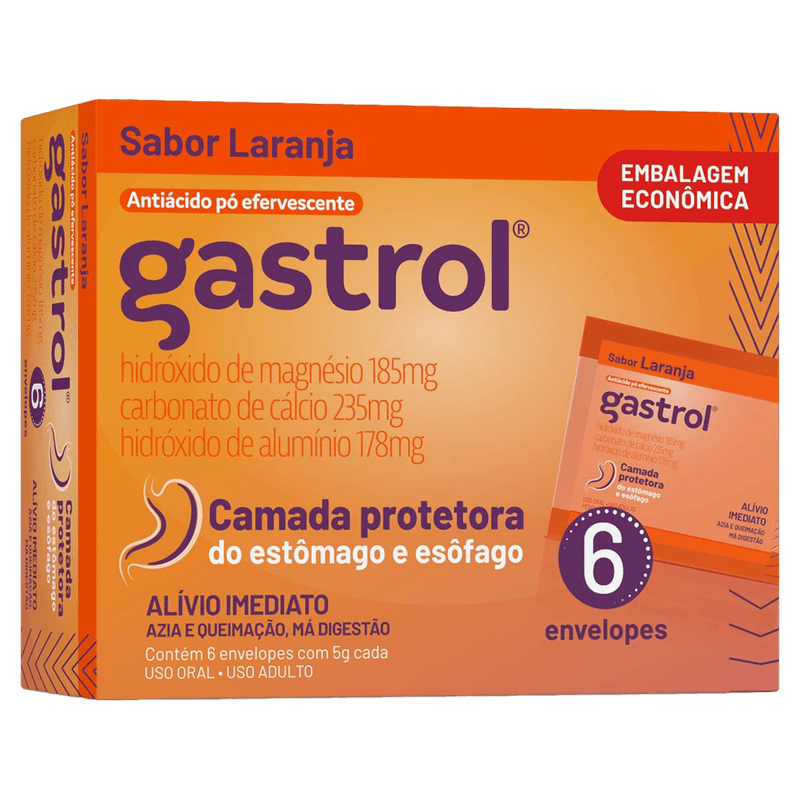 Este antiácido atua formando uma camada protetora no estômago e esôfago, aliviando rapidamente o desconforto. Apresenta sabor laranja e é comercializado em embalagem com 6 envelopes de pó efervescente, facilitando a administração oral. É contraindicado para pessoas com hipersensibilidade aos componentes, doenças renais graves, estados edematosos, alcalose, albuminúria, anemias, hipercalcemia, neoplasias, sarcoidose, colite ulcerativa e desidratação.