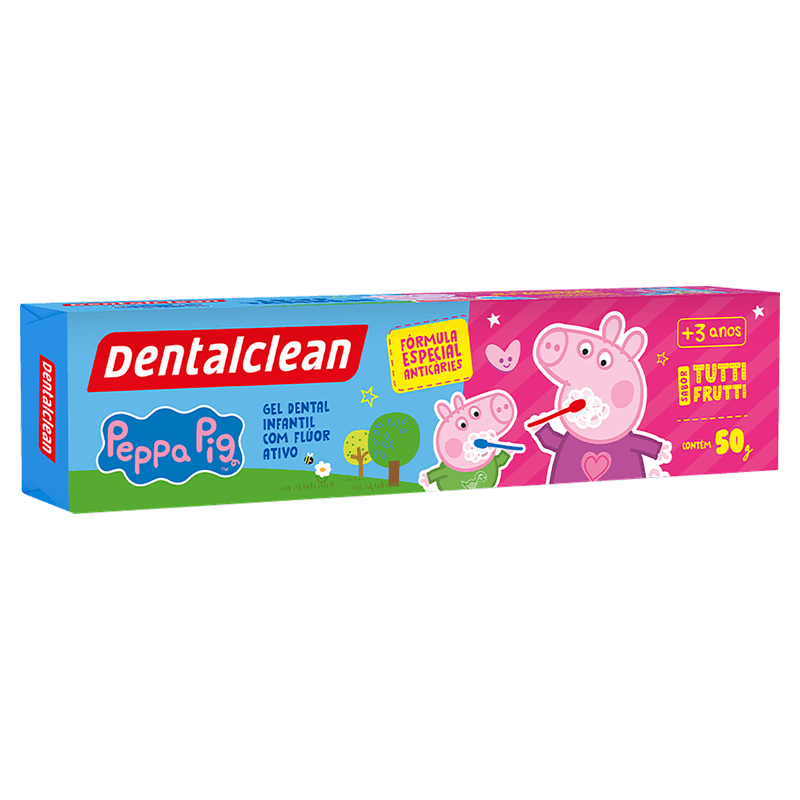 O Gel Dental Infantil Peppa Pig da Dentalclean é um creme dental em tubo de 50g, especialmente formulado para crianças a partir de 3 anos. Com sabor e aroma tutti-frutti, o produto é indicado para a higiene bucal infantil, ajudando na proteção contra cáries.