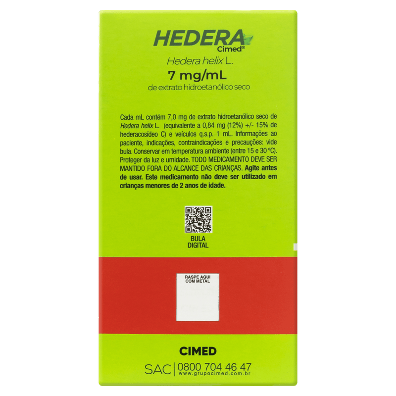 Hedera 7mg/ml Cimed é um xarope fitoterápico indicado para o alívio da tosse produtiva e doenças do trato respiratório. Com extrato seco de Hedera helix, facilita a expectoração e melhora a respiração, proporcionando conforto em quadros gripais e alérgicos. Ideal para adultos, adolescentes e crianças a partir de 2 anos, é uma opção natural para quem busca um tratamento eficaz e seguro.