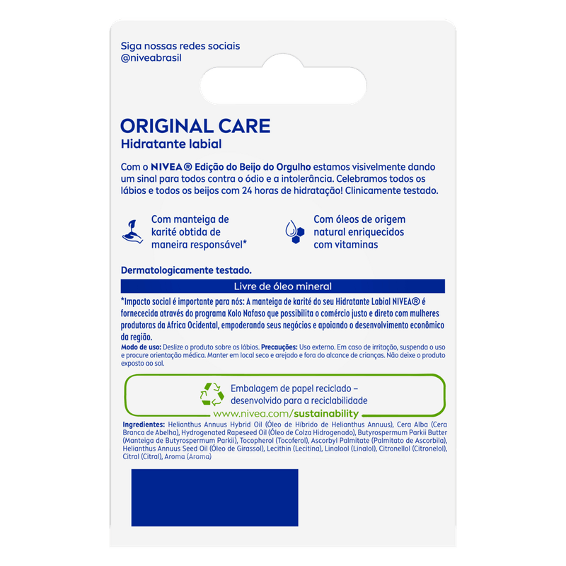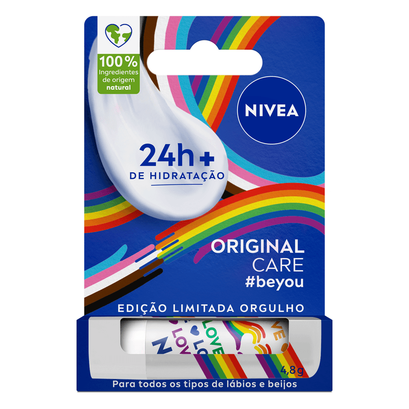Nivea Hidratante Labial Original Care Orgulho oferece 24h de hidratação intensa, com manteiga de karité obtida de maneira responsável e óleos de origem natural. Livre de óleo mineral e dermatologicamente testado, é um símbolo de cuidado e diversidade em uma edição especial.