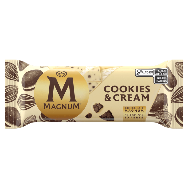O Picolé Magnum Cookies & Cream Kibon é um doce da categoria picolés, apresentado em embalagem individual de 90 ml. Sua principal finalidade é o consumo direto como sobremesa gelada.