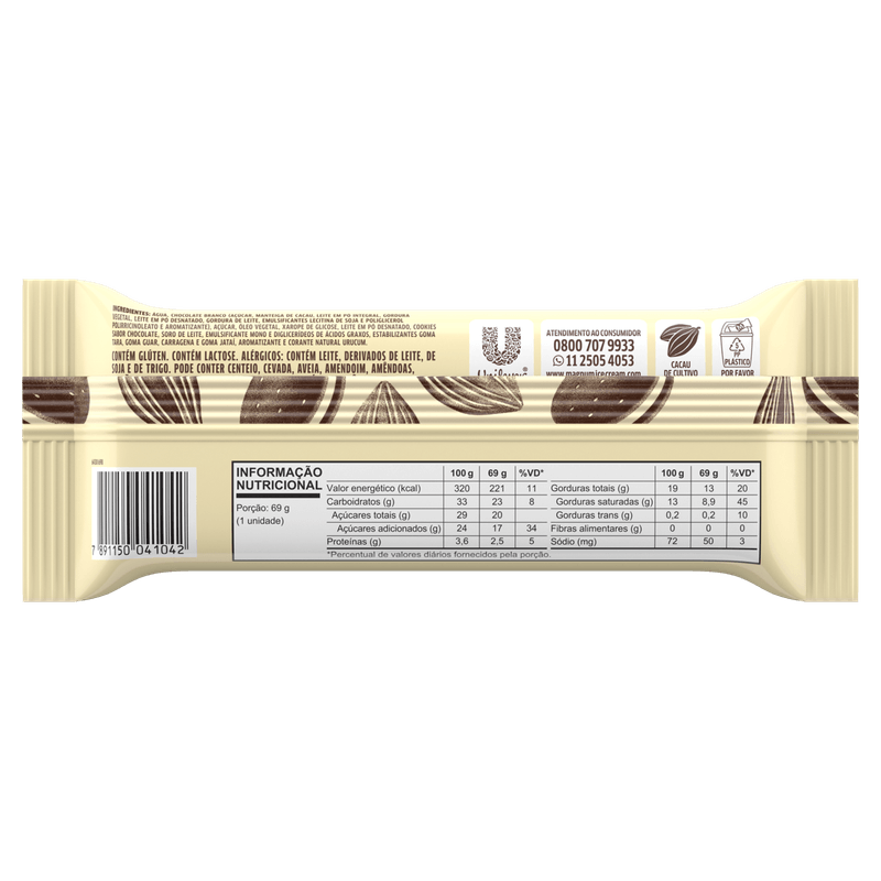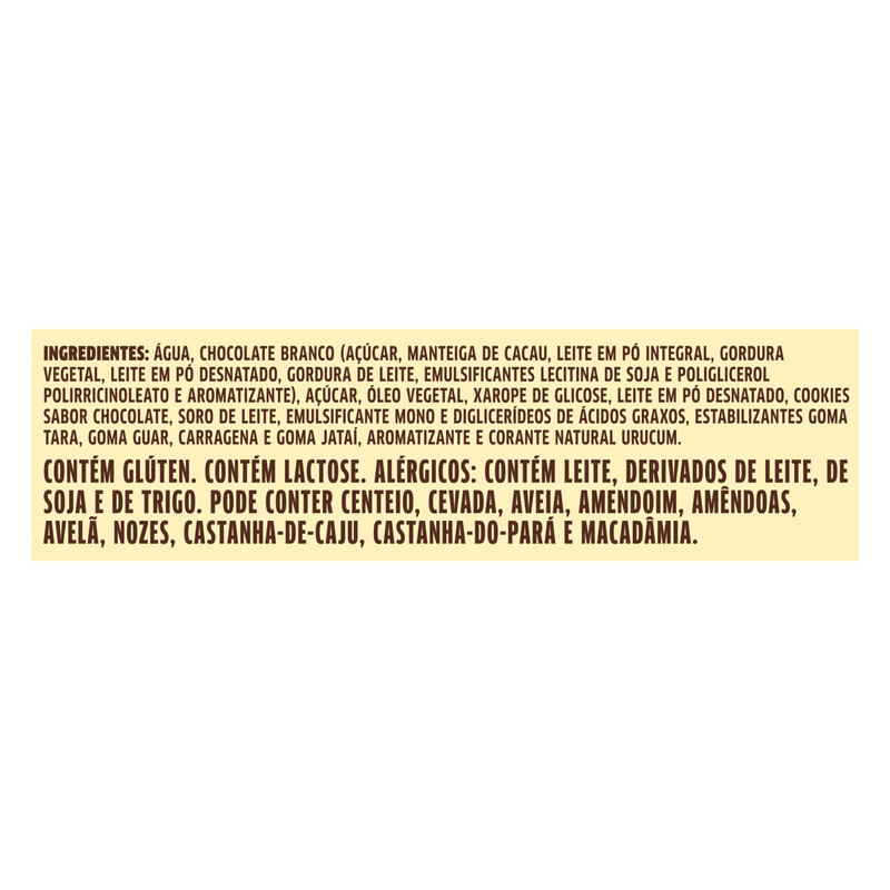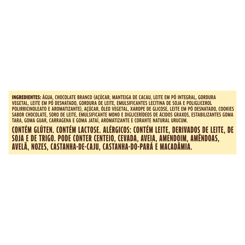 - Ingredientes principais: sorvete cremoso de baunilha, pedaços de cookies sabor chocolate, chocolate branco, leite em pó, óleo vegetal, estabilizantes