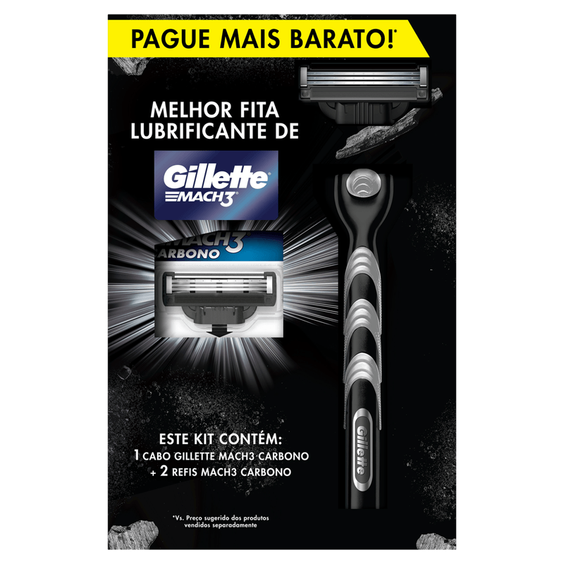 O Kit Aparelho Recarregável Gillette Mach3 Carbono da Procter Perfumaria inclui 1 aparelho recarregável e 2 refis de lâminas Mach3 Carbono, indicado para barbear com precisão e conforto.