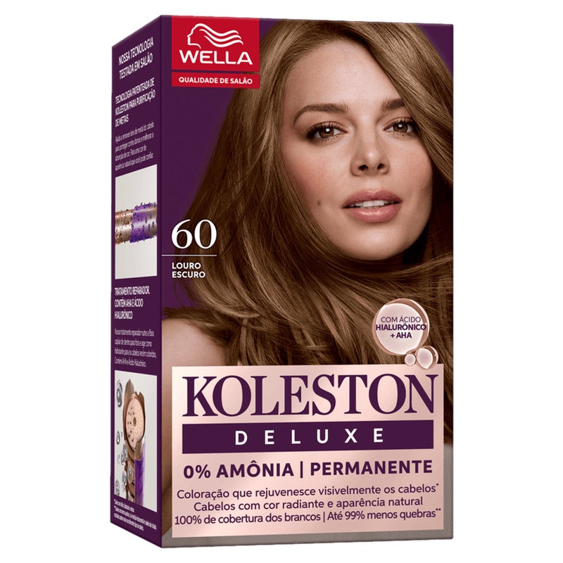 O Kit Koleston Deluxe 60 Louro Escuro é uma coloração permanente em creme, sem amônia, que oferece cobertura total dos fios brancos com cor intensa, duradoura e natural. Enriquecido com ácido hialurônico e AHA, promove hidratação profunda e fortalece os cabelos, reduzindo a quebra e danos, ideal para quem busca um resultado profissional com cuidado extra para a saúde dos fios. Indicado para pessoas que desejam renovar a cor do cabelo com praticidade e segurança, preservando a vitalidade e o brilho.