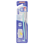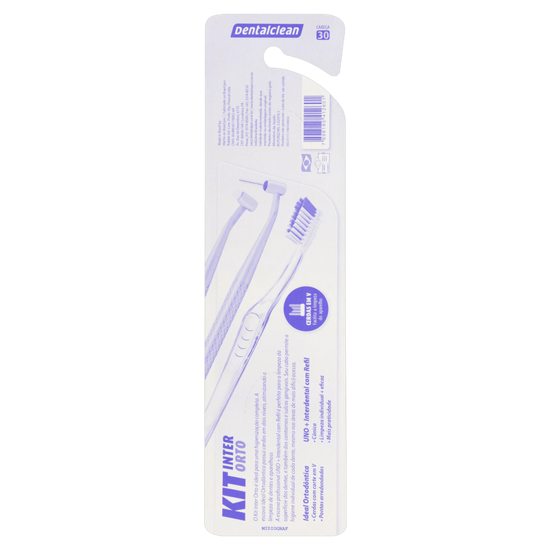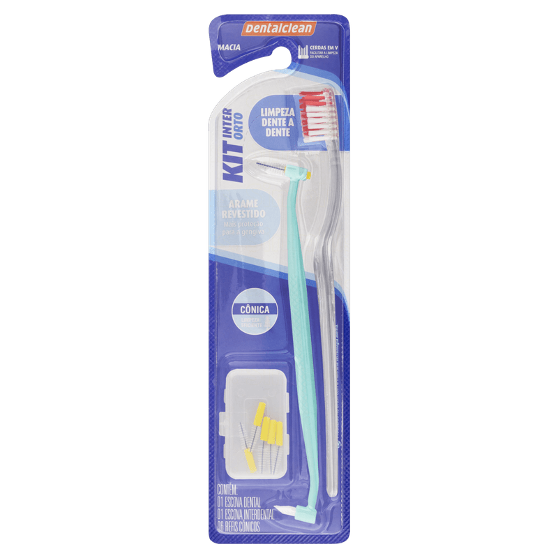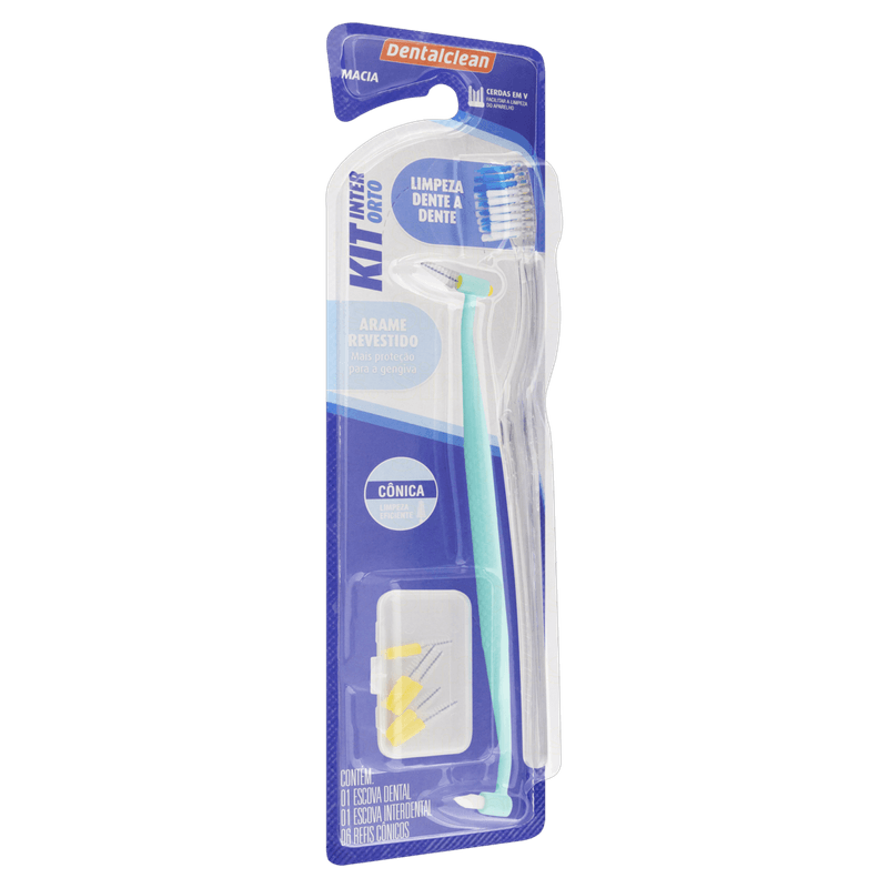 O Kit Ortodôntico Dentalclean é um conjunto completo para higiene bucal destinado a pessoas que utilizam aparelhos ortodônticos. O kit inclui uma escova ortodôntica macia com cabeça pequena e cerdas em formato "V", uma escova interdental cônica e seis refis para limpeza eficaz dos dentes e dos espaços do aparelho.