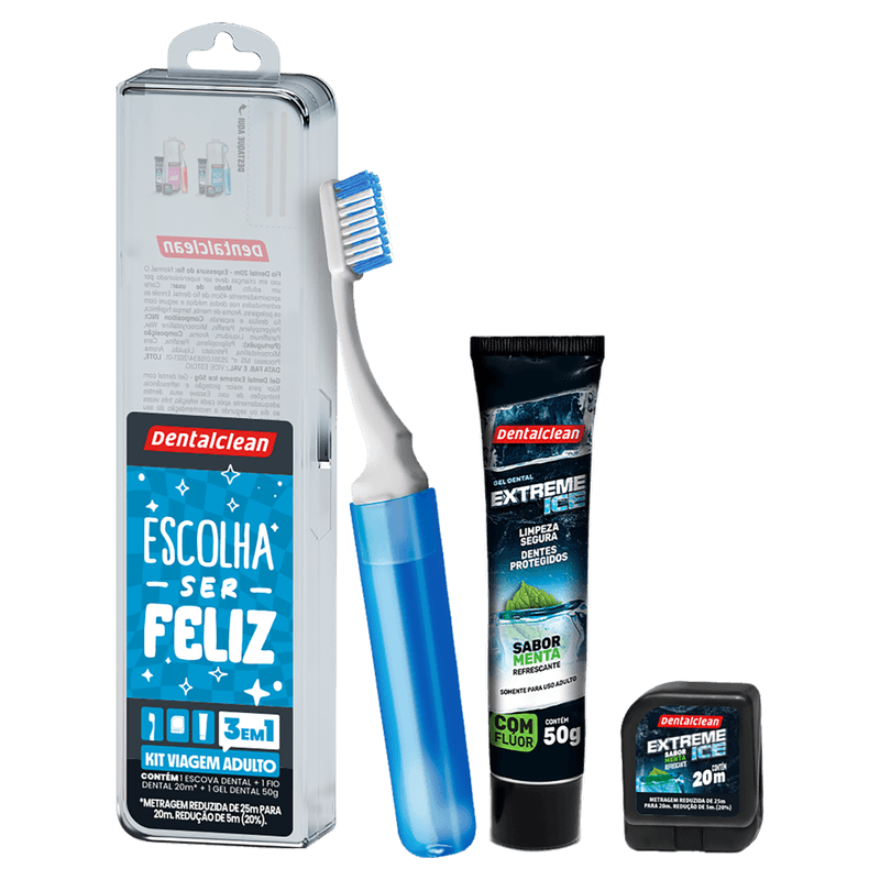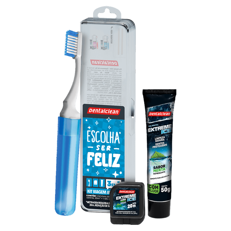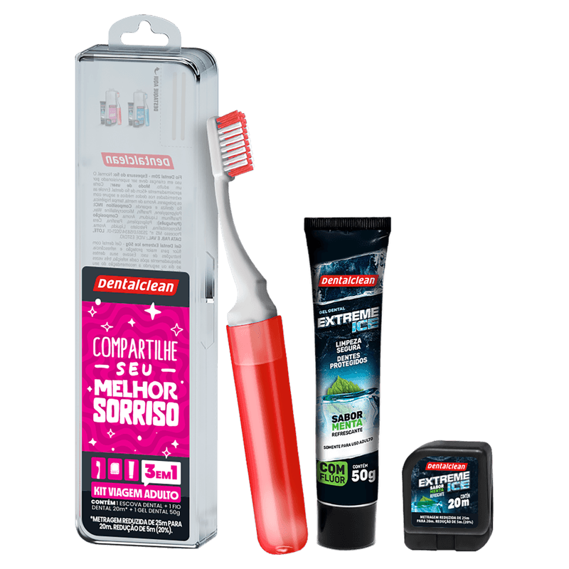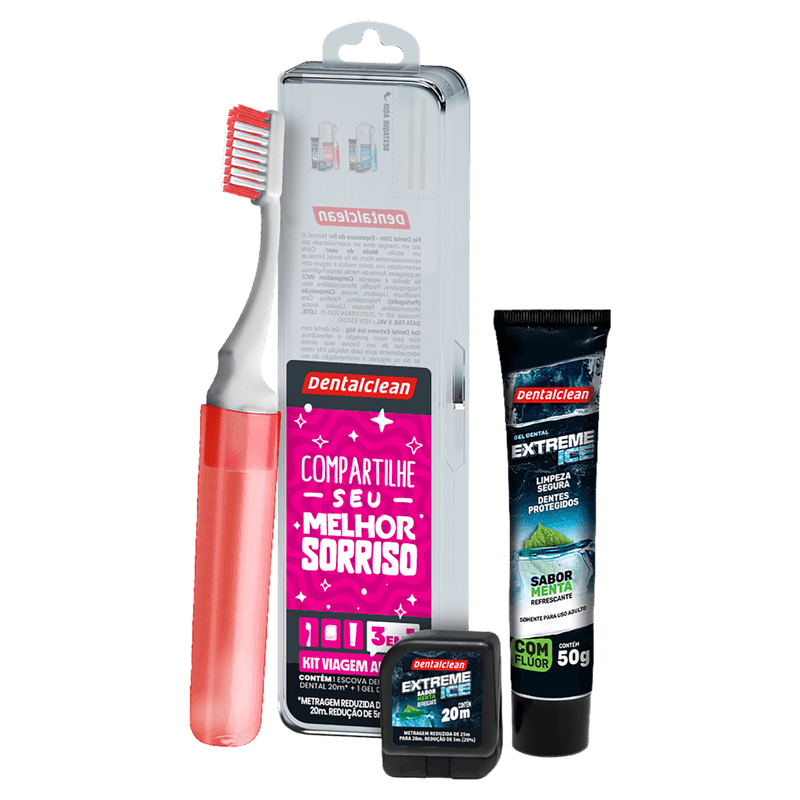 O Kit Escova Dental Viagem + Fio Dental 20m + Gel Dental 50g Menta Extreme Ice Dentalclean é um conjunto prático para higiene bucal, composto por uma escova dental portátil, um fio dental de 20 metros e um gel dental de 50g com sabor menta refrescante. Indicado para adultos, o kit oferece uma limpeza completa e profunda, ideal para uso durante viagens.