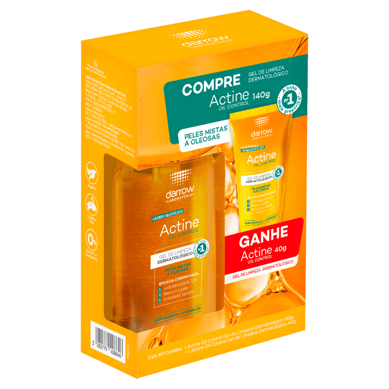 Darrow Actine Oil Control Gel de Limpeza é um higienizador diário das peles mistas a oleosas que reduz os poros, evita o efeito rebote, além de controlar a oleosidade por até 12 horas. Actine Oil Control Gel de Limpeza tem uma fórmula exclusiva com o complexo Oil Control, que une o poder do Ácido Glicólico, que atua no controle eficaz e duradouro da oleosidade e do brilho excessivo e a Vitamina B5, que oferece uma poderosa hidratação e ação anti-inflamatória que atua na reparação e renovação da pele.