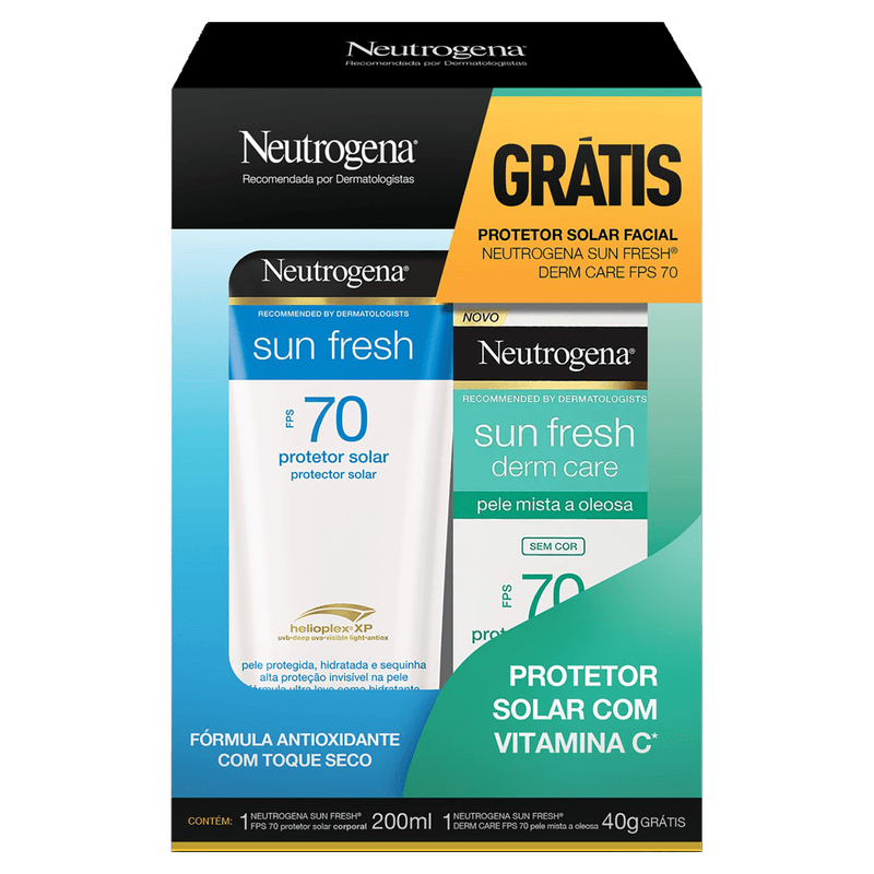 O Kit Protetor Solar Corporal Neutrogena Sun Fresh FPS 70 200ml + Facial FPS 70 40g é composto por um protetor solar corporal em loção e um protetor solar facial em creme, ambos com alta proteção contra os raios UVA e UVB, além de proteção contra a luz visível. O protetor corporal possui fórmula oil free, textura ultraleve e é resistente à água, enquanto o protetor facial oferece controle da oleosidade e efeito matte.