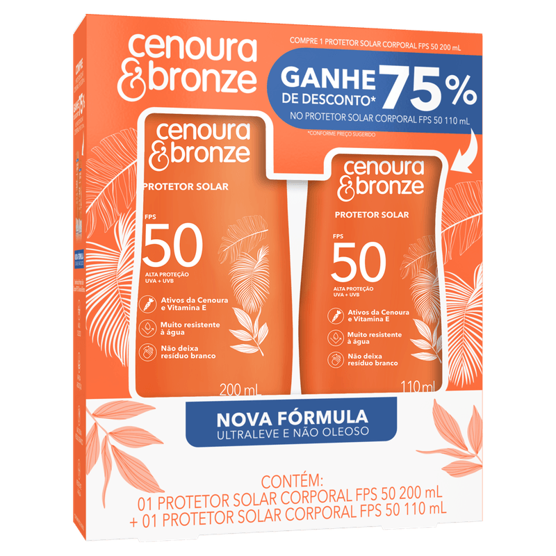 O Kit Protetor Solar Corporal Cenoura & Bronze FPS 50 oferece alta proteção contra os raios UVA e UVB, prevenindo queimaduras solares e o envelhecimento precoce da pele. Com fórmula ultraleve, não oleosa e de rápida absorção, é enriquecido com ativos de cenoura e vitamina E, garantindo hidratação prolongada sem deixar resíduos brancos. Resistente à água, é ideal para quem busca proteção eficaz durante atividades ao ar livre e contato com água. Indicado para adultos que desejam cuidar da pele do corpo com conforto e segurança.