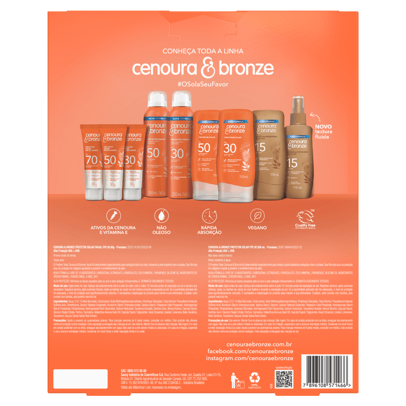 O Kit Protetor Solar Cenoura & Bronze oferece proteção eficaz contra os raios UVA e UVB com FPS 30, ideal para quem busca cuidado completo para a pele do corpo e do rosto. Composto por um protetor solar corporal de 200 ml e um protetor solar facial de 50 g, ambos com toque seco, o kit proporciona uma sensação ultraleve e não oleosa, perfeita para uso diário. Sua fórmula ajuda a prevenir vermelhidão, ardência e manchas causadas pelo sol, além de contribuir para a manutenção da firmeza e elasticidade da pele, preservando o colágeno e promovendo hidratação contínua. Indicado para adultos e todos os tipos de pele, é a escolha certa para quem deseja proteção e cuidado com conforto.