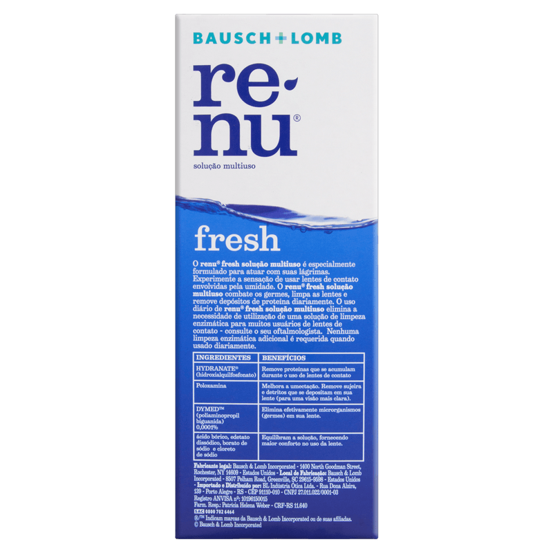 O Kit Renu Fresh da Bausch + Lomb é indicado para a limpeza, desinfecção, enxágue, lubrificação e hidratação de lentes de contato gelatinosas e de silicone hidrogel. Destina-se a usuários que necessitam manter suas lentes livres de proteínas, fungos, bactérias e outras impurezas que possam causar desconforto ocular.