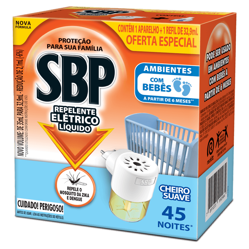 SBP Repelente Elétrico Líquido protege o ambiente por até 45 noites (considerando o uso de 8 horas por dia), possui cheiro suave e é eficaz contra mosquitos e pernilongos, incluindo o mosquito da Dengue, Zika e Chikungunya.