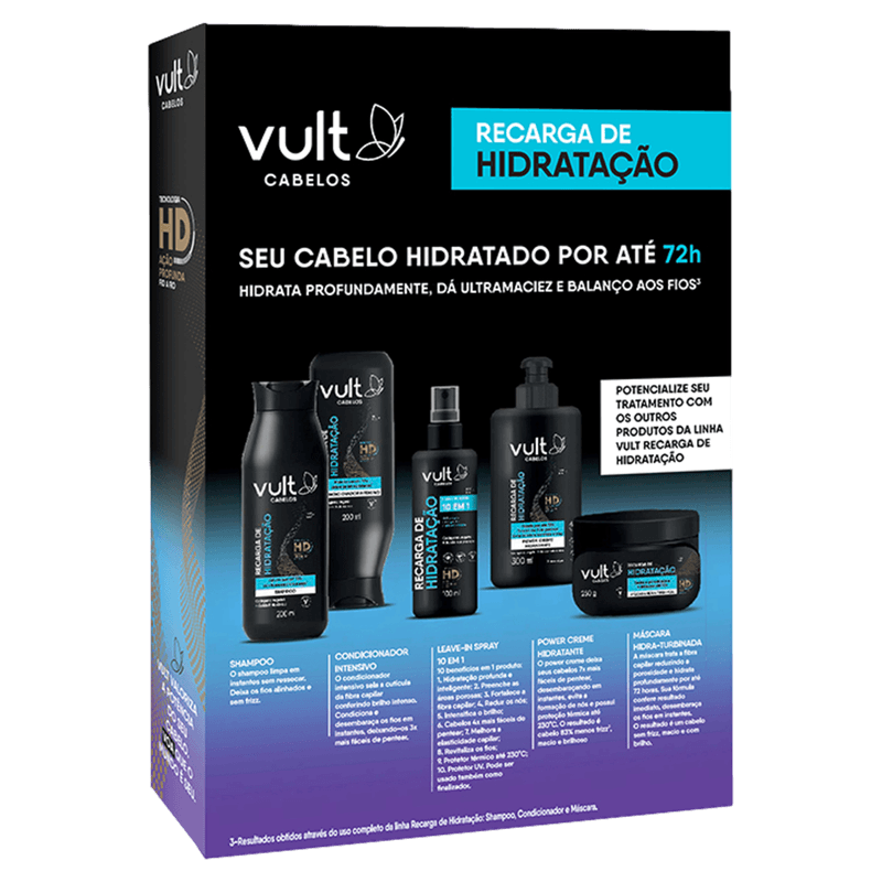 Kit Vult Cabelos Recarga de Hidratação: Shampoo 200ml + Condicionador 200ml, esse kit é ideal para sua rotina capilar. Com Colágeno Vegetal e Ácido Hialurônico, hidrata profundamente por até 72 horas, deixando os cabelos macios e com balanço. A Tecnologia HD repara fio a fio com aminoácidos de alto potencial.