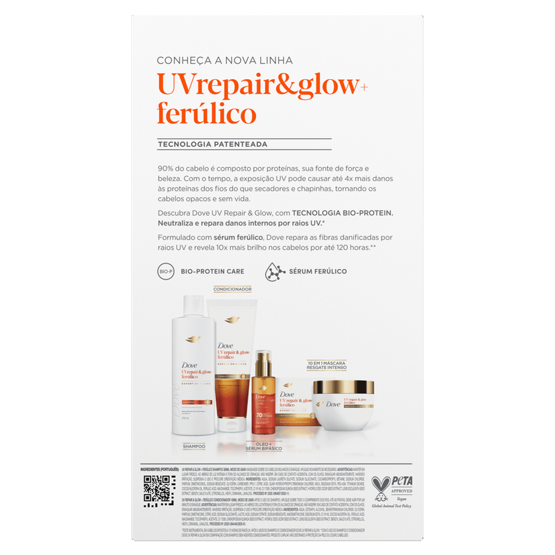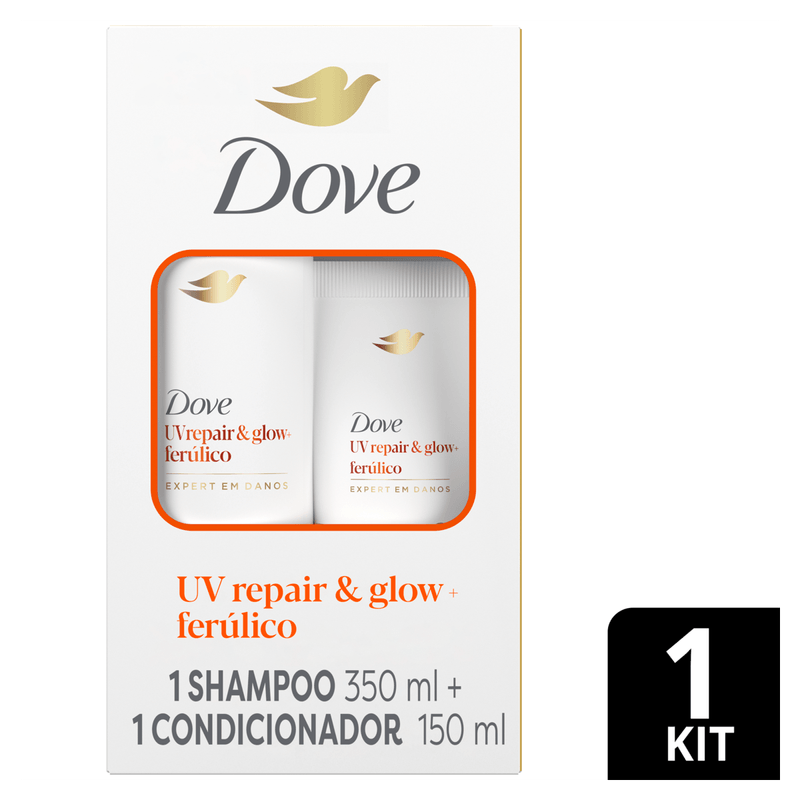 O Kit Shampoo 350ml + Condicionador 150ml Dove UV Repair e Glow + Ferúlico foi desenvolvido para proteger, reparar e dar brilho aos fios expostos ao sol. Com fórmula enriquecida com Ácido Ferúlico, o kit ajuda a restaurar os cabelos danificados pelos raios UV, hidratando profundamente, reduzindo o ressecamento e fortalecendo a fibra capilar. O shampoo limpa suavemente, enquanto o condicionador nutre e desembaraça, deixando os fios mais macios, brilhantes e saudáveis. Ideal para uso diário, garante vitalidade e movimento natural aos cabelos.