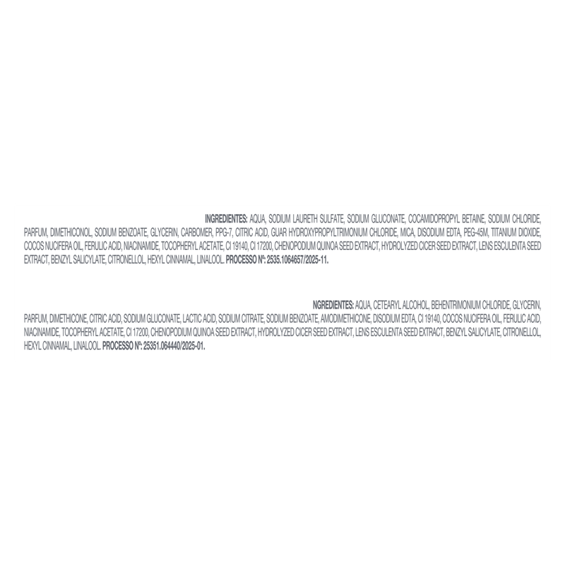 Condicionador: aqua, cetearyl alcohol, behentrimonium chloride, glycerin, parfum, dimethicone, citric acid, sodium gluconate, lactic acid, sodium citrate, sodium benzoate, amodimethicone, disodium EDTA, CI 19140, cocos nucifera oil, ferulic acid, niacinamide, tocopheryl acetate, CI 17200, chenopodium quinoa seed extract, hydrolyzed cicer seed extract, lens esculenta seed extract, benzyl salicylate, citronellol, hexyl cinnamal, linalool.